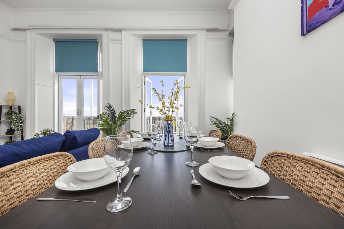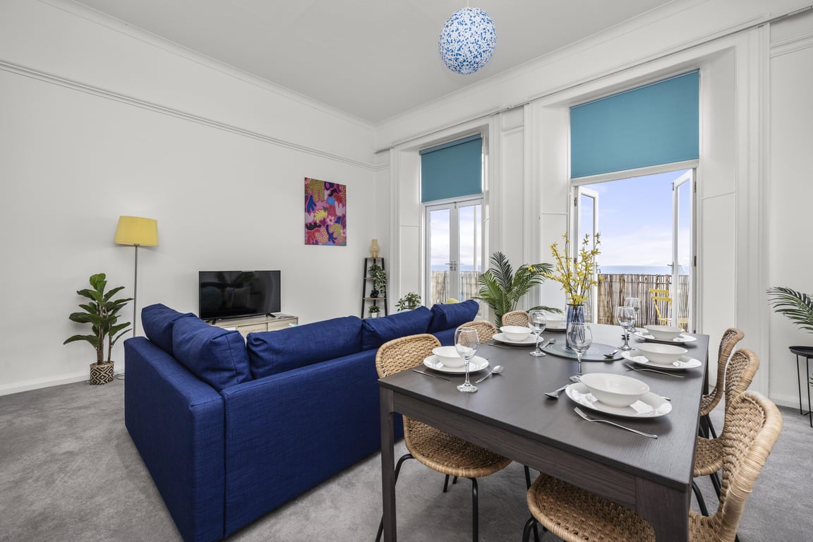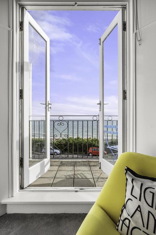 With gorgeous, direct sea views and just a 1 min stroll to the beach, this two bedroom apartment is perfect for couples, families or working professionals with a double sofa bed in the living area too. The spacious, bright living room with incredibly high ceilings includes a designated work space and Smart TV for streaming your favourite platforms, a dining area seating up to 6 guests a fully equipped kitchen and your own private balcony. Just a stone's throw away from the seafront, Brighton Pier and city centre, this is the perfect Brighton getaway!