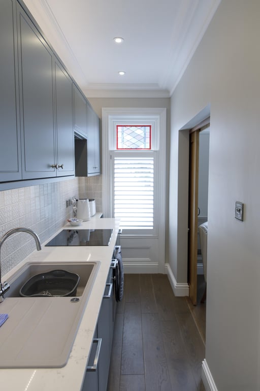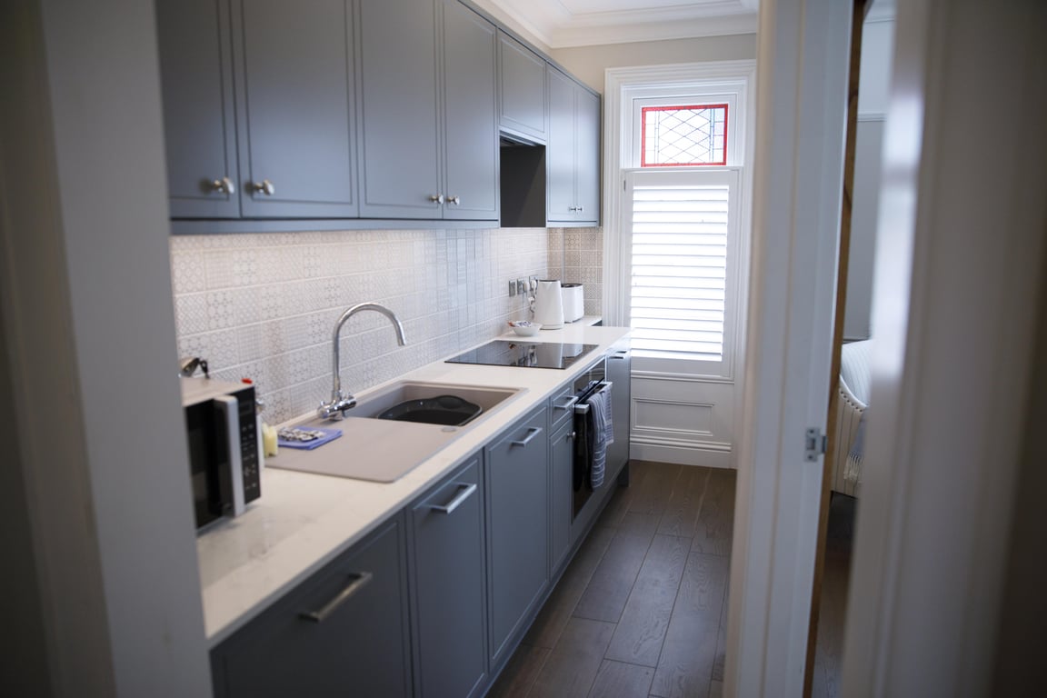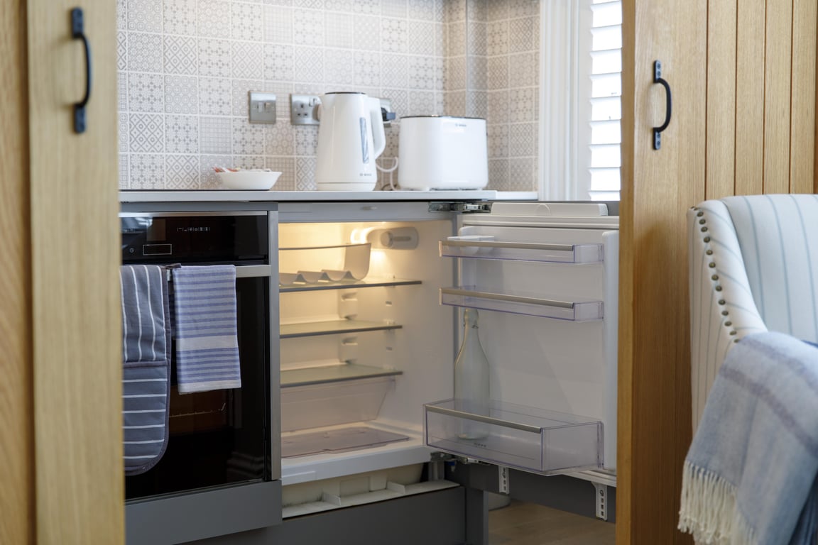 The kitchen has tonnes of natural daylight pouring in and opens out with sliding doors into the living area. The fully equipped kitchen has a dishwasher, microwave, oven, plus plenty of cookware, glassware, crockery and cutlery so you can easily cook up a brunch or lunch for everybody. In addition to this we offer complimentary tea and coffee, salt and pepper - so please help yourself. The dining table seats up to 4 guests.
