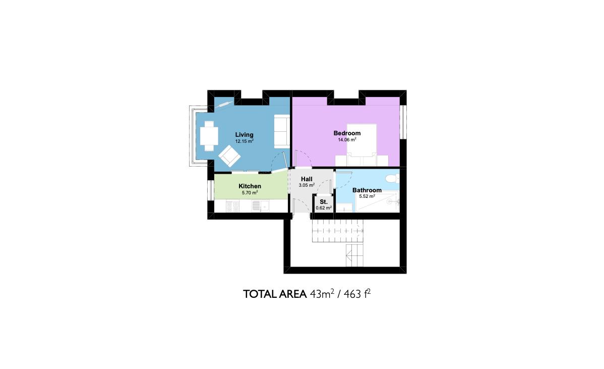 You’ll find the sociable and light living room set up with a Smart TV and sofa bed not yet made up as a bed, making it a lovely space for chilling out, getting together for a few drinks or catching up on the events of the day. If you prefer, you can simply relax and watch a movie on the TV.