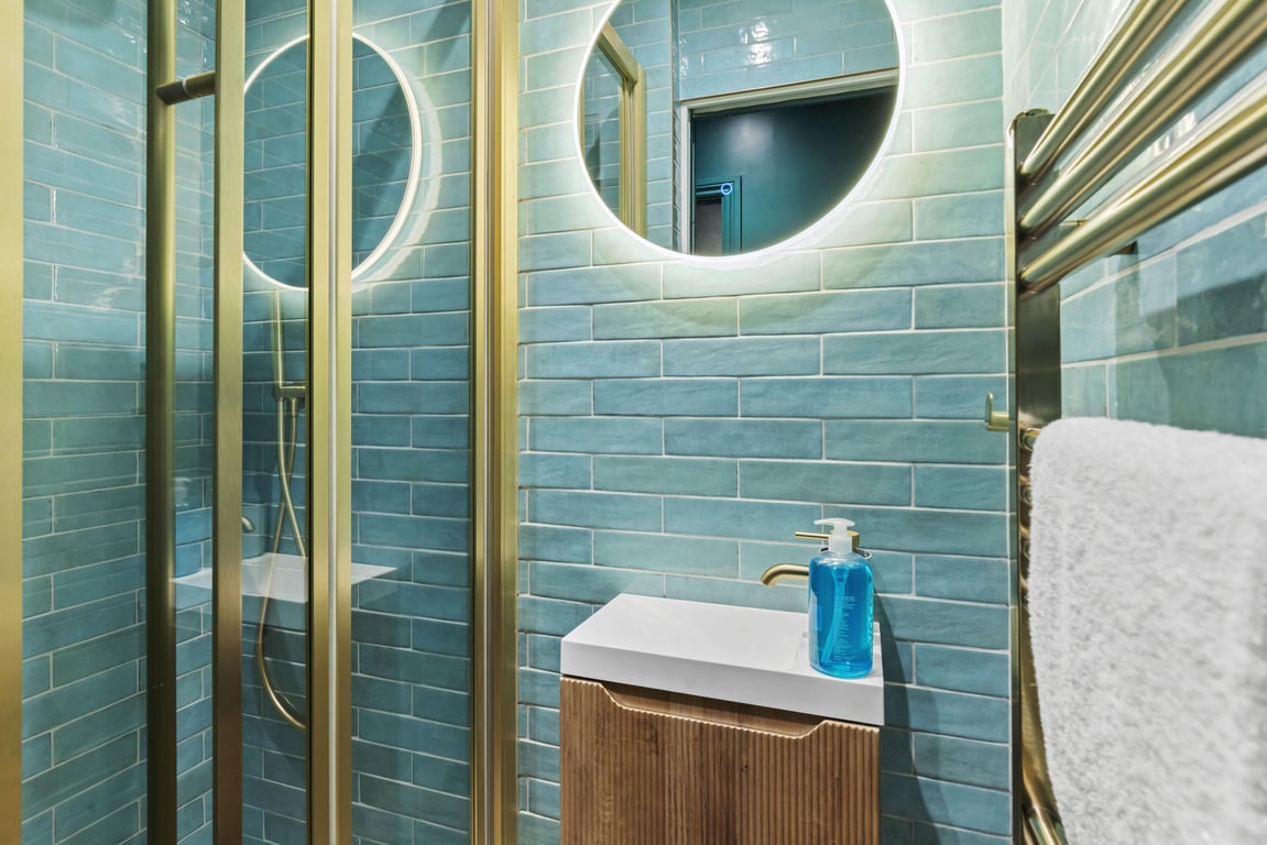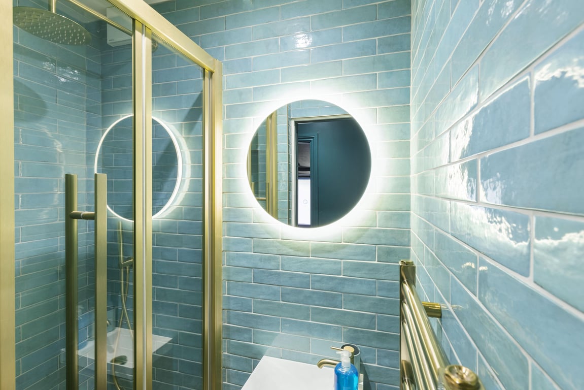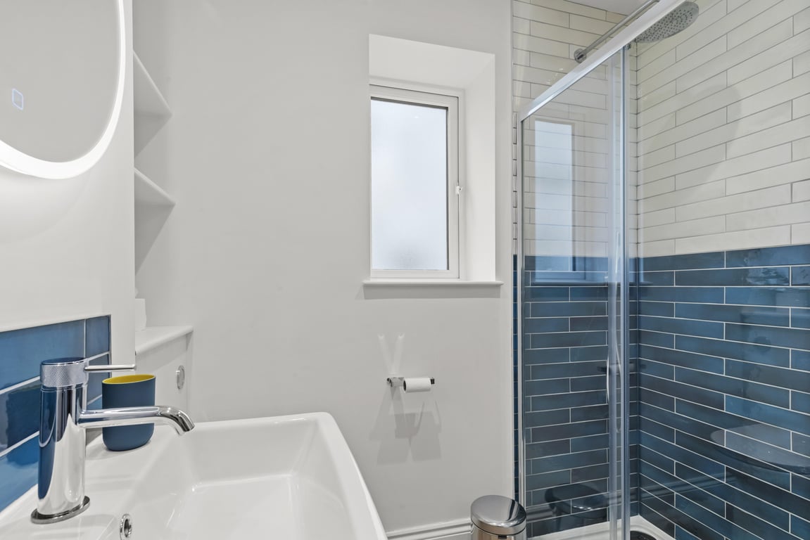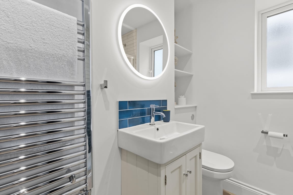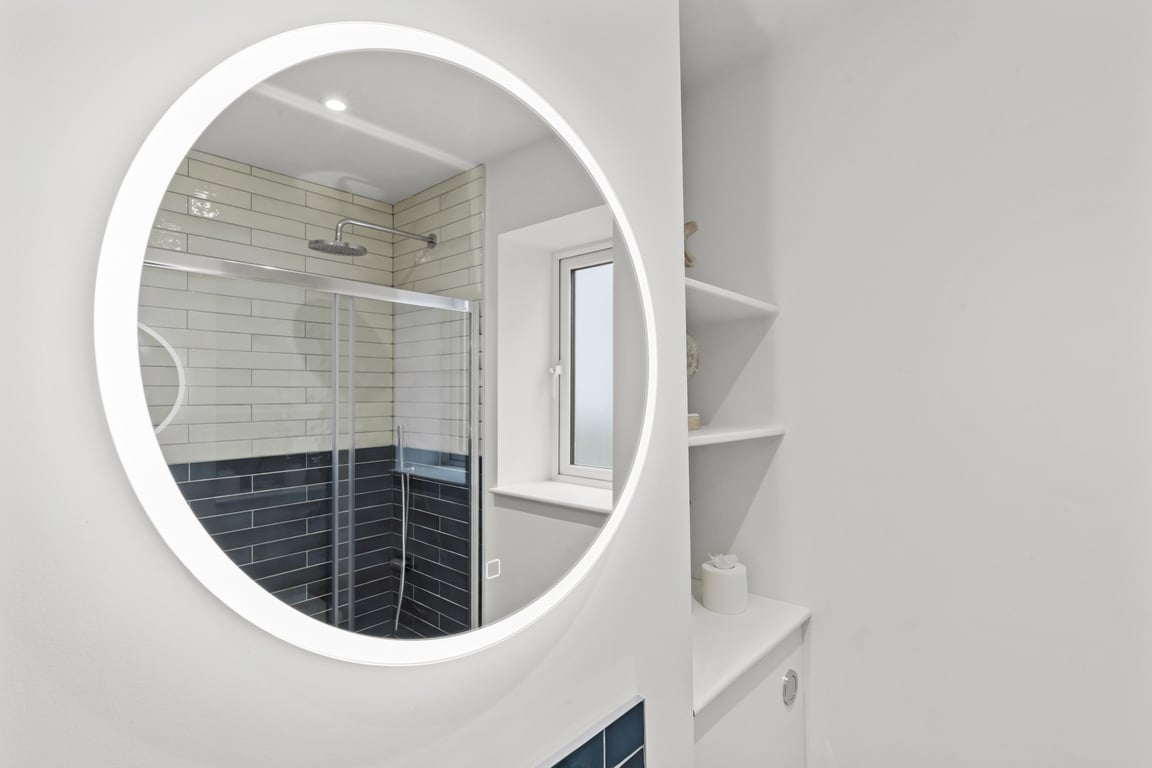 - The main bathroom has a shower, sink, LED mirror and toilet.