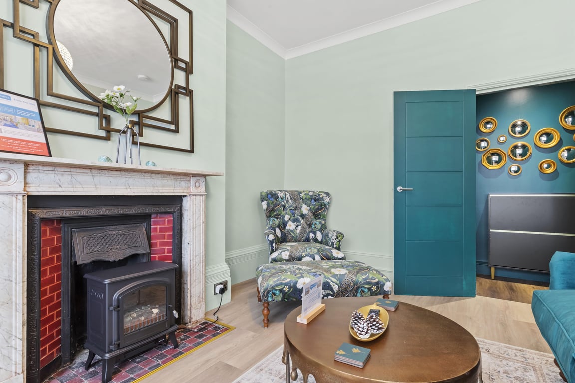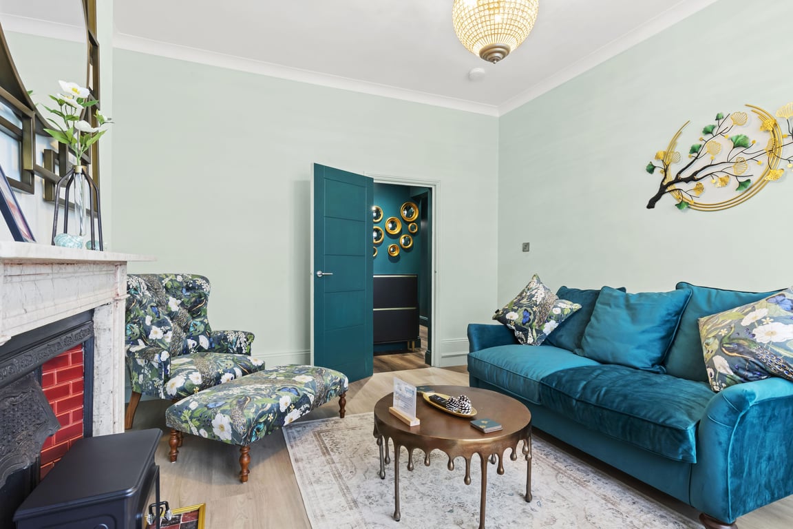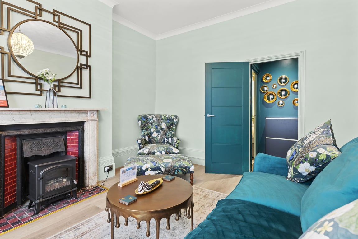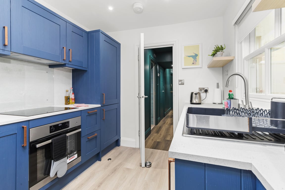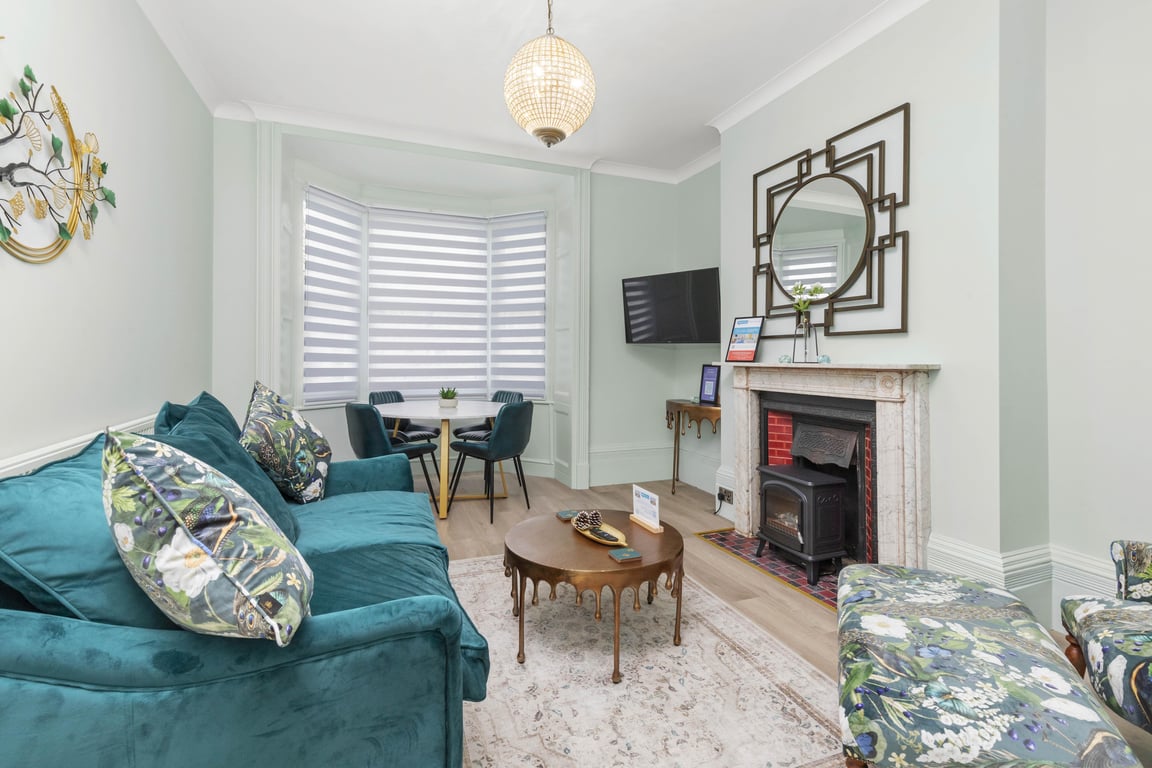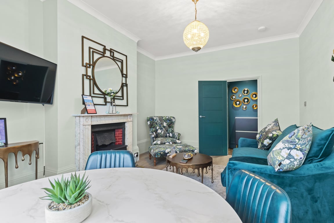 Overlooking a serene regency square, the living area has tonnes of natural daylight. With blues and greens and coastal themes, including furnishings by the Vintage Sofa Company, you'll find the sociable and light living room a lovely space for chilling out, getting together for a few drinks or catching up on the events of the day. If you prefer, you can simply relax and watch a movie on the Smart TV.