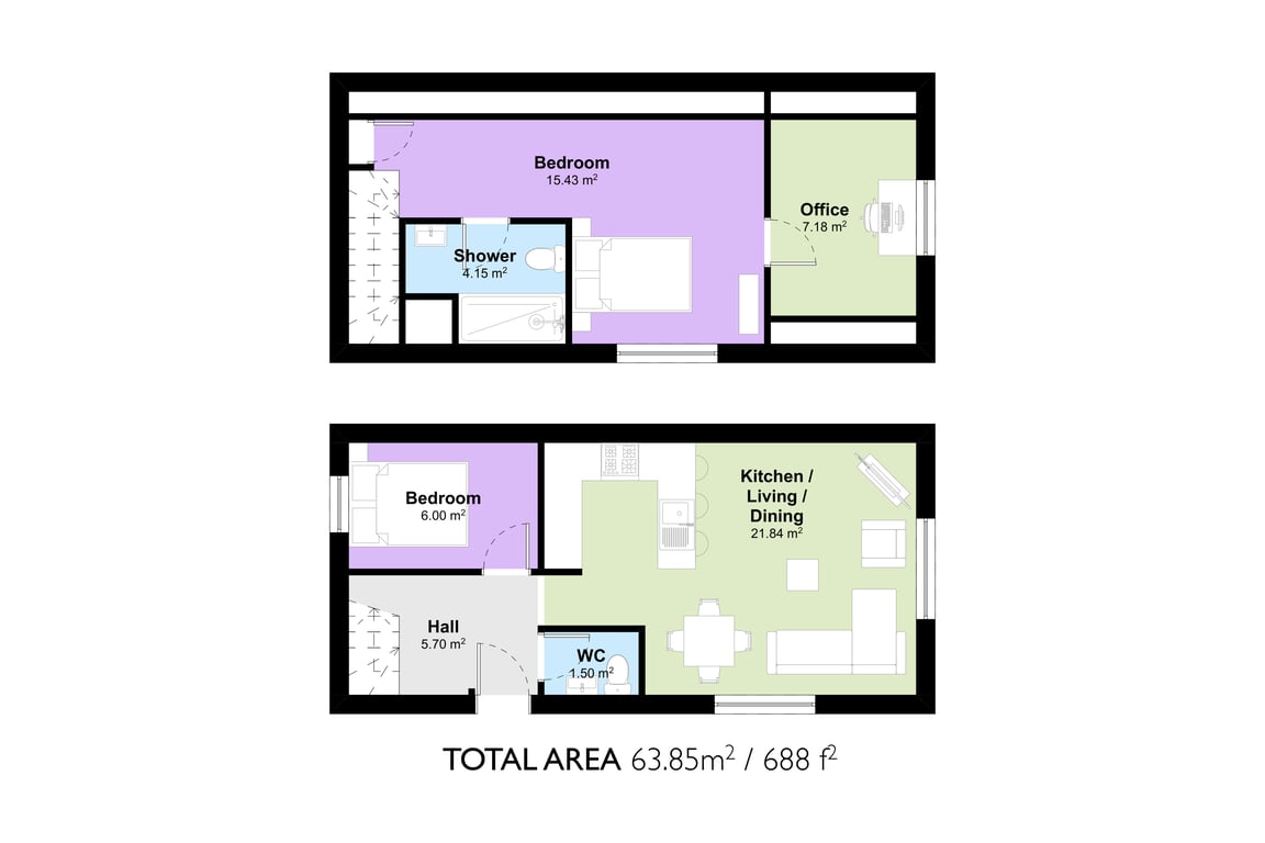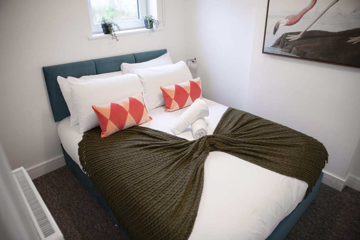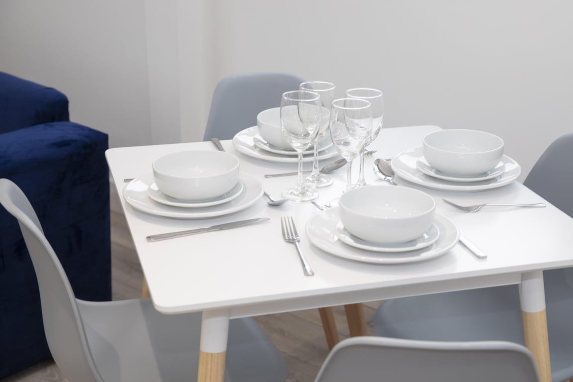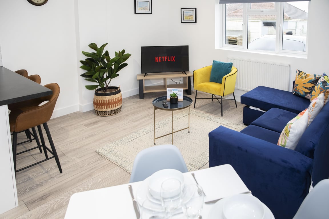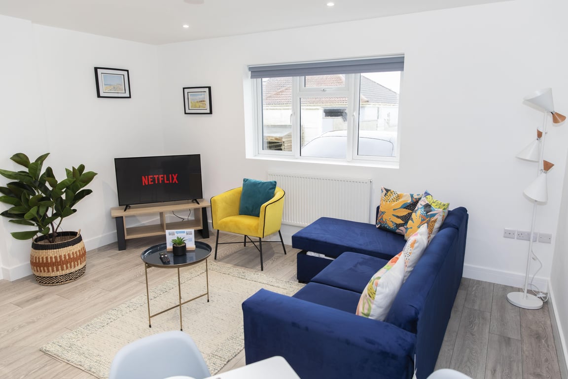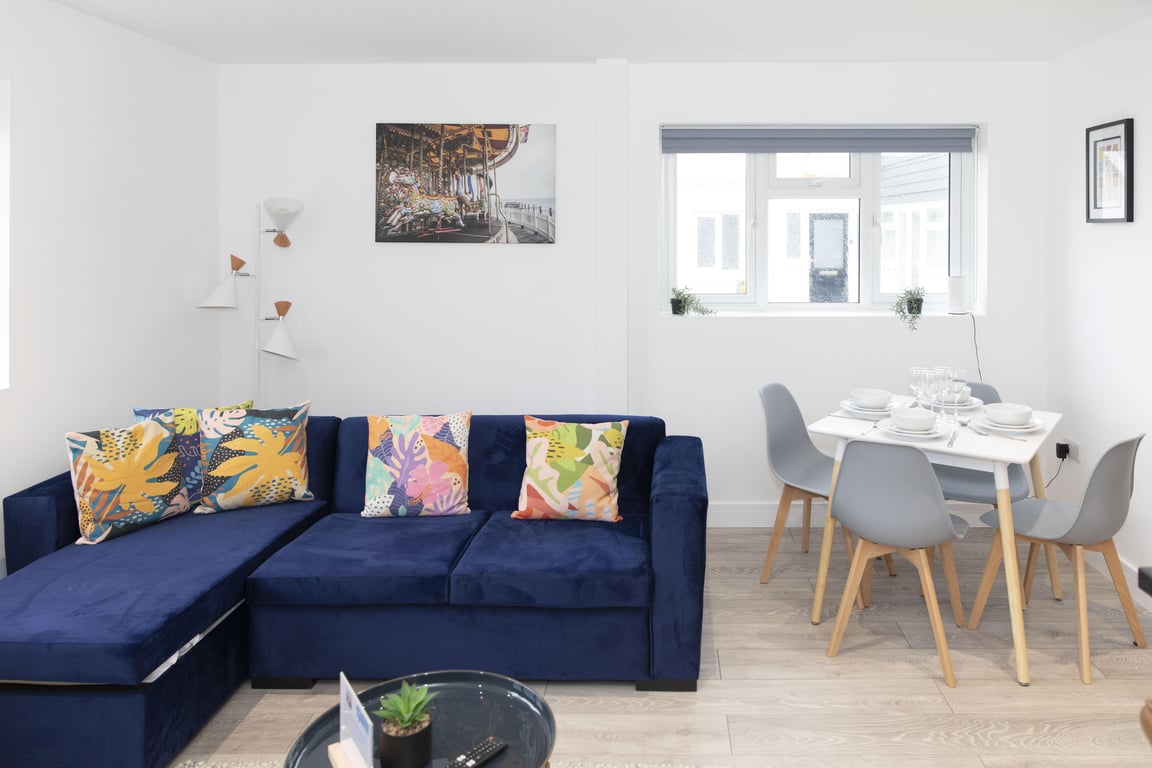 The living area has a ton of natural daylight pouring in, and the fully equipped kitchen has a washing machine, oven, kettle, plus plenty of cookware, glassware, crockery and cutlery so you can easily cook up a brunch or lunch for everybody. In addition to this, we offer complimentary tea and coffee, salt and pepper - so please help yourself. The dining table seats up to 4 guests. You’ll find the sociable and light living room set up with a Smart TV and large L-shaped double sofa bed not yet made up as a bed, making it a lovely space for chilling out, getting together for a few drinks or catching up on the events of the day. If you prefer, you can simply relax and watch a movie on the TV.