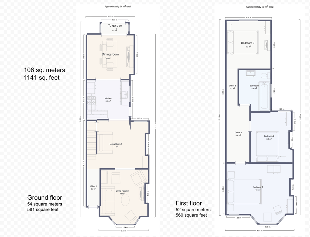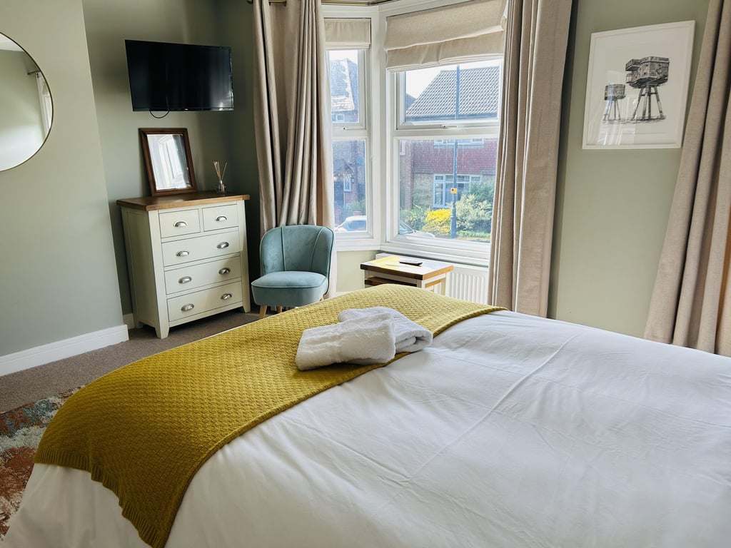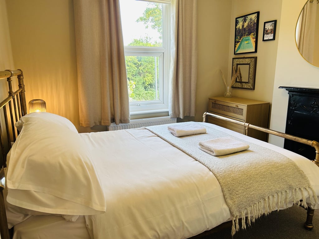 The living area has a ton of natural daylight pouring in and the fully equipped kitchen has a washing machine, oven, kettle plus plenty of cookware, glassware, crockery and cutlery so you can easily cook up a brunch or lunch for everybody. In addition to this we offer complimentary tea and coffee, salt and pepper - so please help yourself. The dining table seats up to 6 guests. You’ll find the sociable and light living room set up with a Smart TV and two comfortable sofas, making it a lovely space for chilling out, getting together for a few drinks or catching up on the events of the day. If you prefer, you can simply relax and watch a movie on the TV.