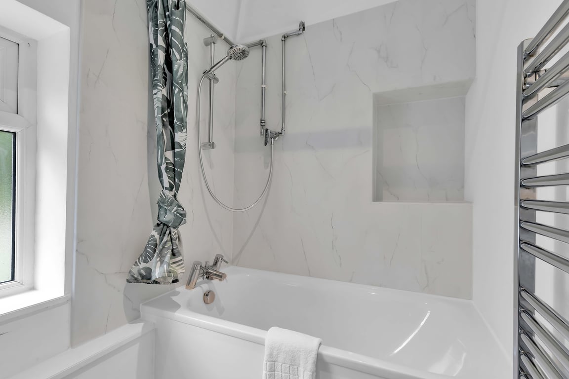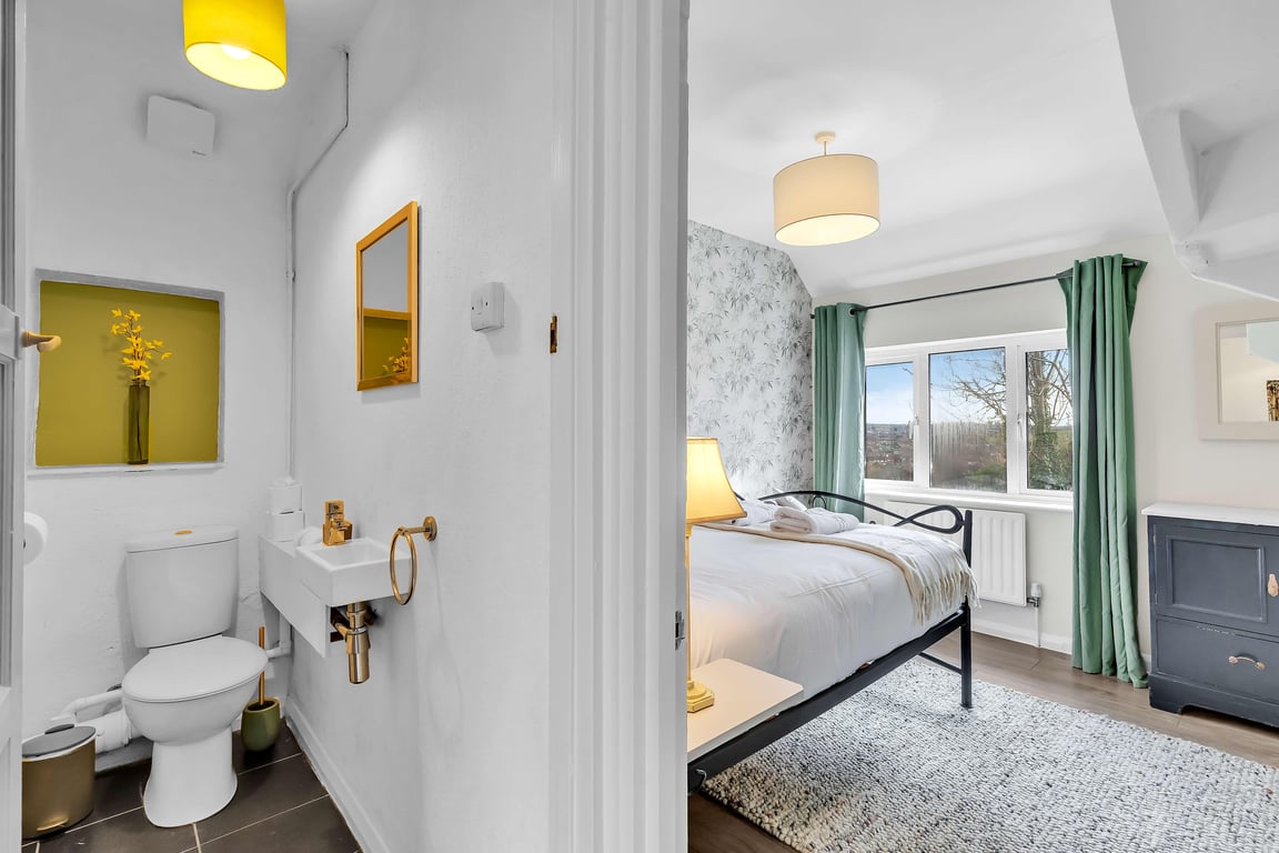 This open plan kitchen/living area has a ton of natural daylight pouring in, and the fully equipped kitchen has a hob oven and kettle, plus plenty of cookware, glassware, crockery and cutlery so you can easily cook up a brunch or lunch for everyone in your group. In addition we offer complimentary tea and coffee, salt and pepper - so please help yourself. You’ll find the separate lounge TV room set up with a Smart TV to access your own Netflix and Amazon Prime accounts, and an L-shaped sofa bed not yet made up as a bed, making it a lovely space for chilling out, getting together for a few drinks or catching up on the events of the day. If you prefer, you can simply relax and watch a movie on the TV.
