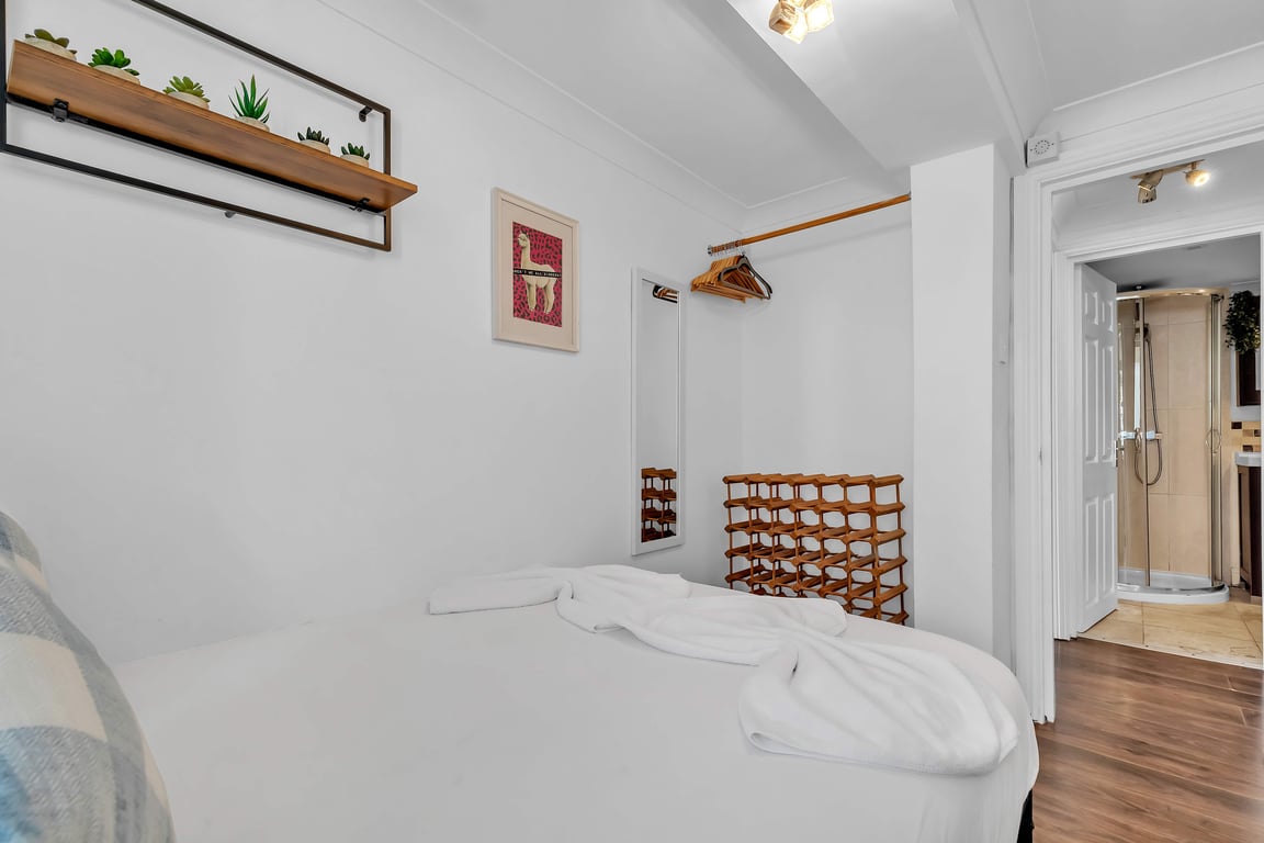 This bright and sociable open-plan space is perfect for relaxing or entertaining. The fully equipped kitchen features an oven, gas hob, washing machine, kettle, microwave, fridge-freezer, and a full set of cookware, crockery, glassware and cutlery – ideal for preparing brunch or dinner at home. Complimentary tea, coffee, salt and pepper are provided for your convenience to get you started in your stay. The dining table comfortably seats up to 4 guests. In the living area, natural light fills the room and a Smart TV is available for streaming your favourite shows. A double sofa bed (not made up, so you can enjoy it during your stay) with linen is provided, completing this welcoming and flexible space.