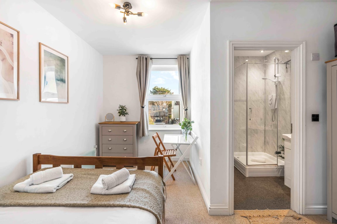 - The bedroom offers a peaceful retreat with a cosy double bed, sleeps 2, a dressing table for getting ready or enjoying a quiet moment, and an ensuite bathroom with a shower, toilet and basin.