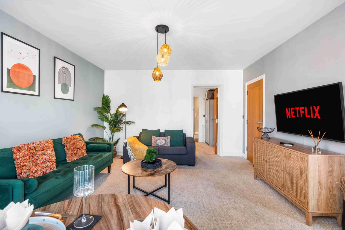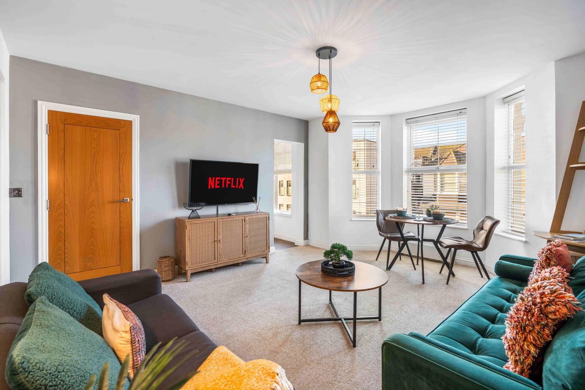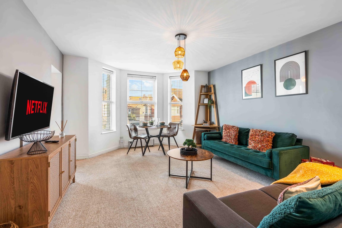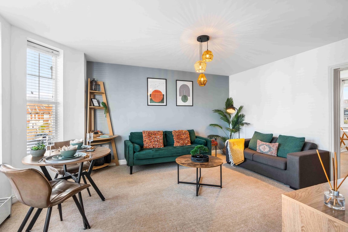 Queens Cove with Seaviews is set a few steps from the beautiful Worthing seafront. This bright first-floor apartment sleeps 4 guests and offers the perfect blend of modern comfort and coastal calm. The location could not be more convenient, with Worthing Beach only a two-minute stroll away and Worthing Pier a short walk along the promenade. The apartment is situated on a peaceful residential street, yet you are just moments away from cafés, shops, and the lively seaside atmosphere that makes Worthing such a welcoming destination. Inside, guests enjoy a relaxed, airy space with a comfortable one-bedroom studio featuring a spacious living room, two sofas, and a dining nook set in the charming bay window, which offers a small but lovely glimpse of the sea.