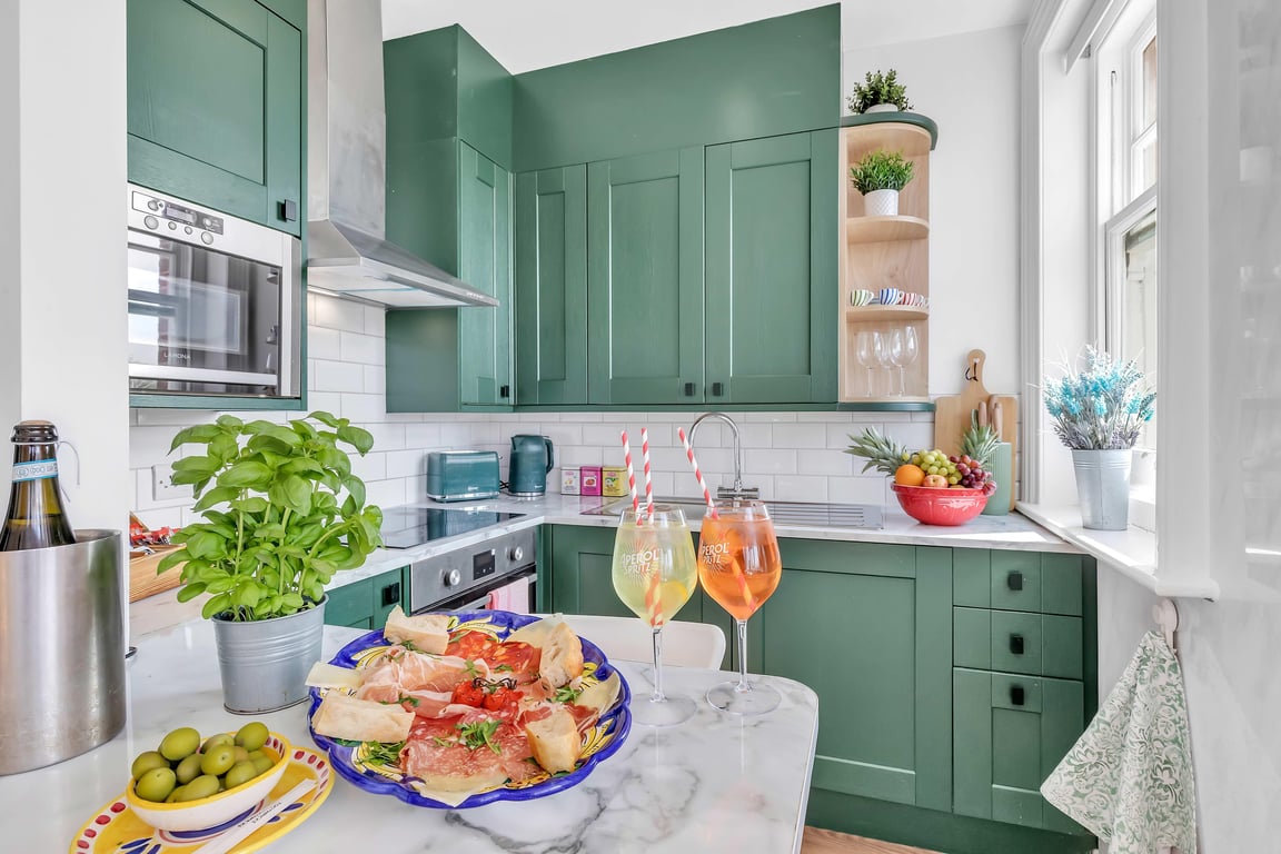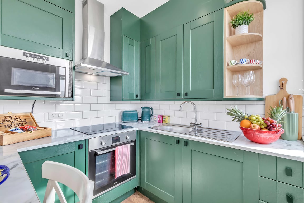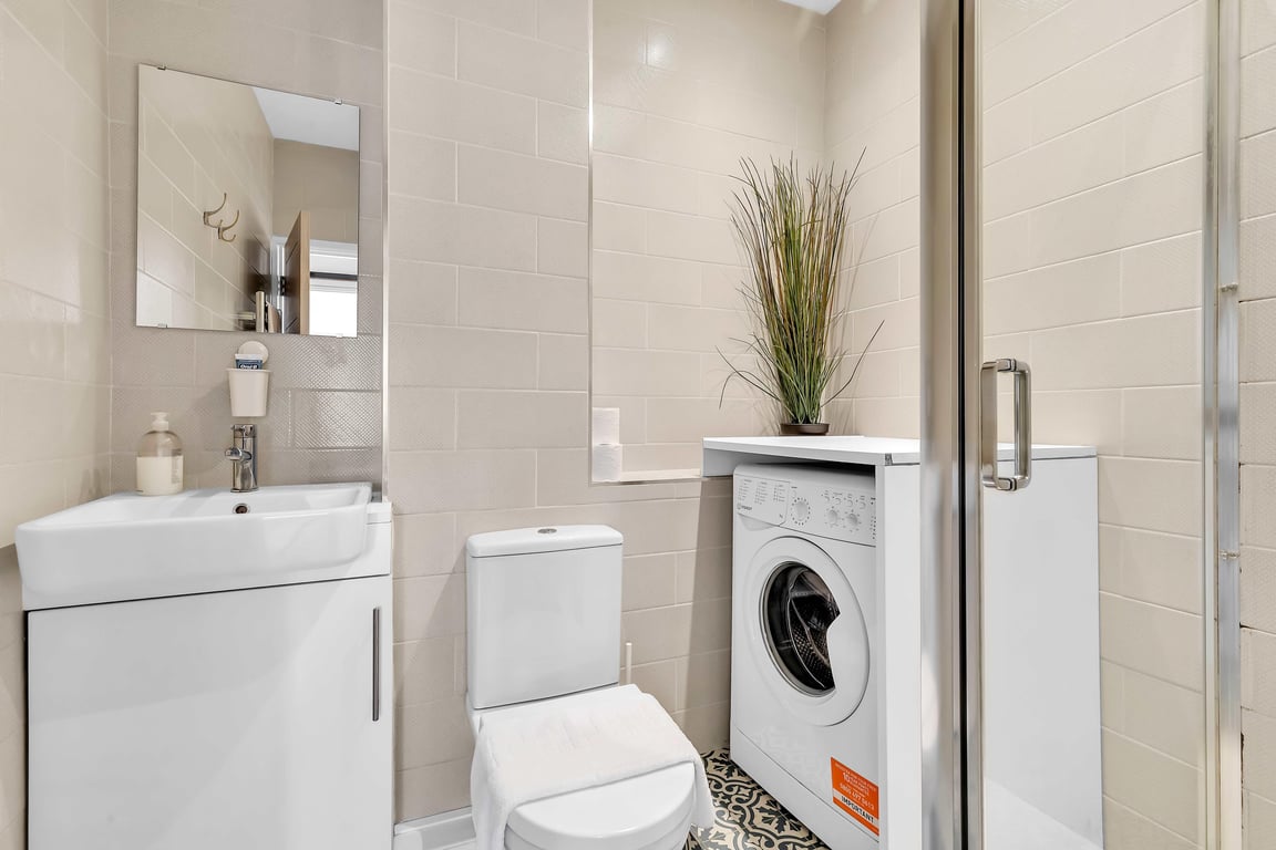 The living area has natural daylight pouring in and the fully equipped kitchen has a washing machine, electric hob, kettle, microwave, plus plenty of cookware, glassware, crockery and cutlery so you can easily cook up a brunch or lunch for everybody. In addition to this, we offer complimentary tea and coffee, salt and pepper - so please help yourself. The dining table seats up to 4 guests. You’ll find the sociable and light living room set up with a Smart TV for streaming all your favourite shows, making it a lovely space for chilling out, getting together for a few drinks or catching up on the events of the day. If you prefer, you can explore the buzzing area and highlights by foot.