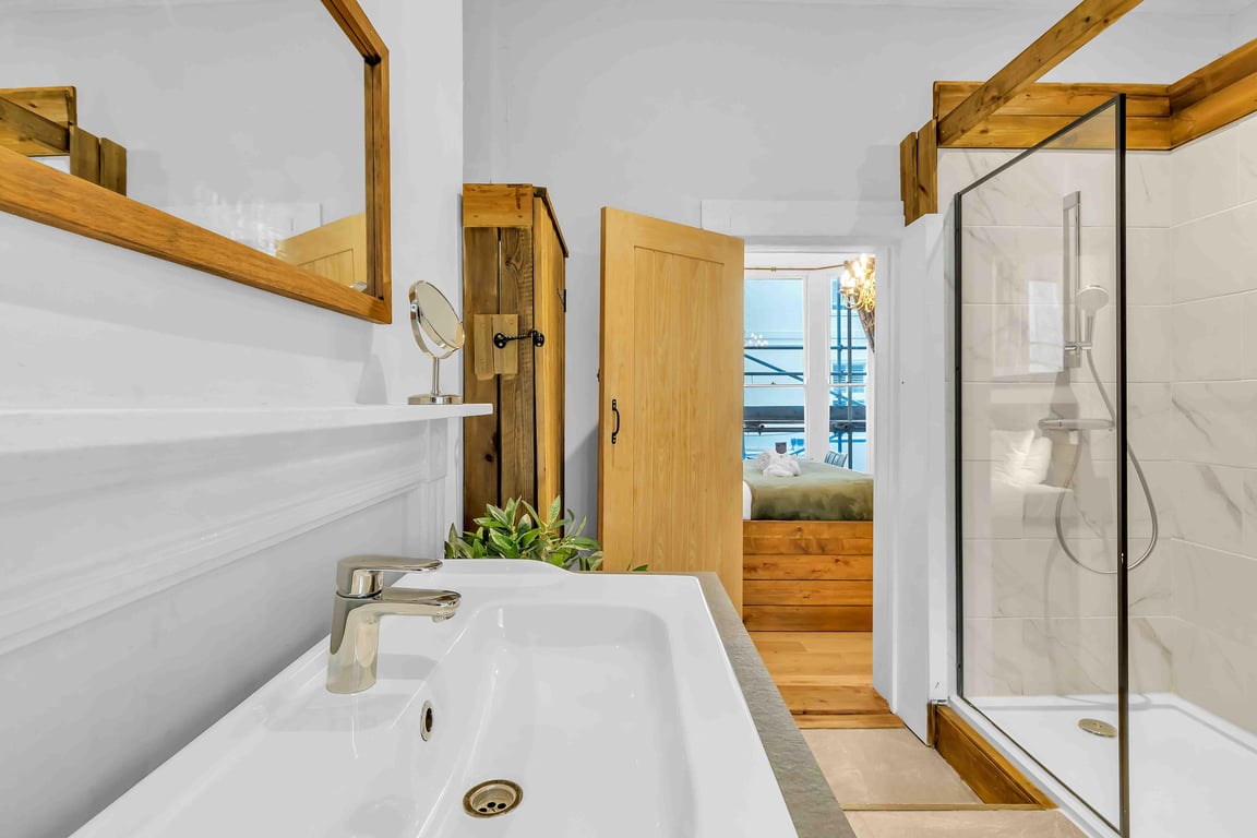 The open-plan studio has been thoughtfully designed with charm and character, featuring exposed wood details and visually pleasing interiors. With space to dine or work, a Tassimo coffee machine, and a large Smart TV, the apartment combines comfort with style. The enormous bed ensures a restful night’s sleep, and other essentials, including a kettle, bar fridge, microwave, crockery, glassware, and cutlery, are provided for your convenience, and we also offer complimentary tea and coffee, salt and pepper – so please help yourself.