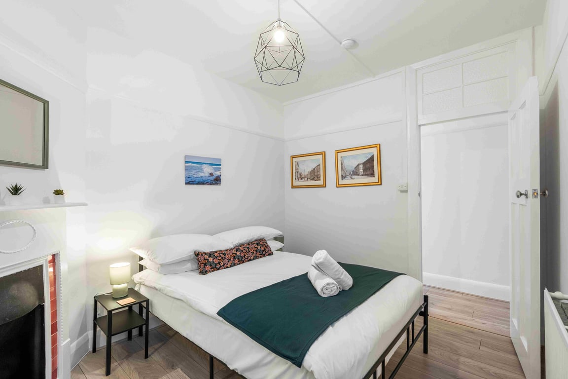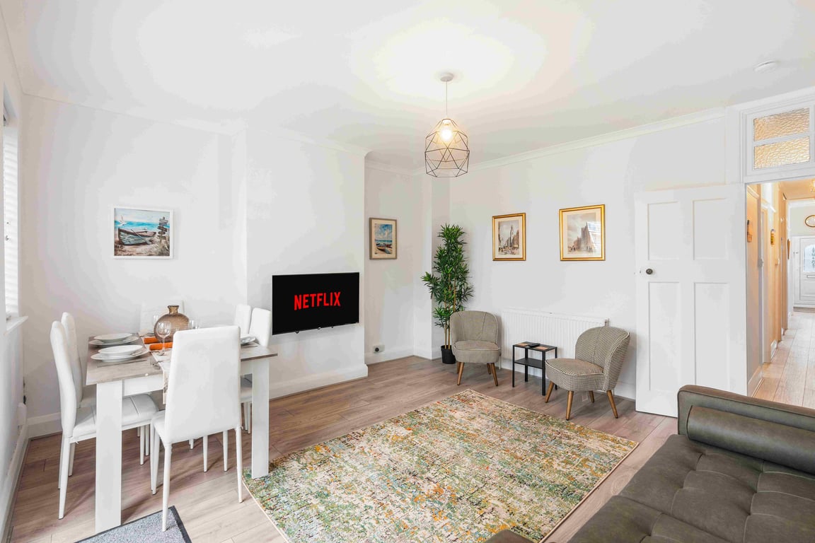 The living area is filled with an abundance of natural light, creating a bright and welcoming space, and the fully equipped kitchen has a washing machine, dryer, hob & oven, kettle, plus plenty of cookware, glassware, crockery and cutlery so you can easily cook up a brunch or lunch for everybody. In addition to this, we offer complimentary tea and coffee, salt and pepper - so please help yourself. The dining table seats up to 6 guests. You’ll find the sociable and light living room set up with a Smart TV and double sofa bed, not yet made up as a bed, making it a lovely space for chilling out, getting together for a few drinks or catching up on the events of the day. If you prefer, you can simply relax and watch a movie on the TV.
