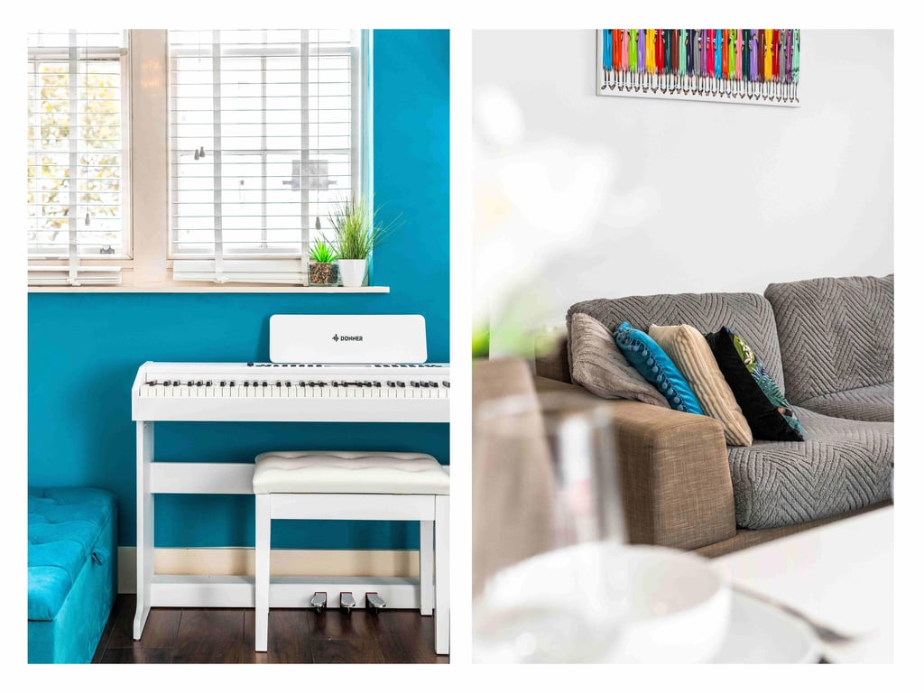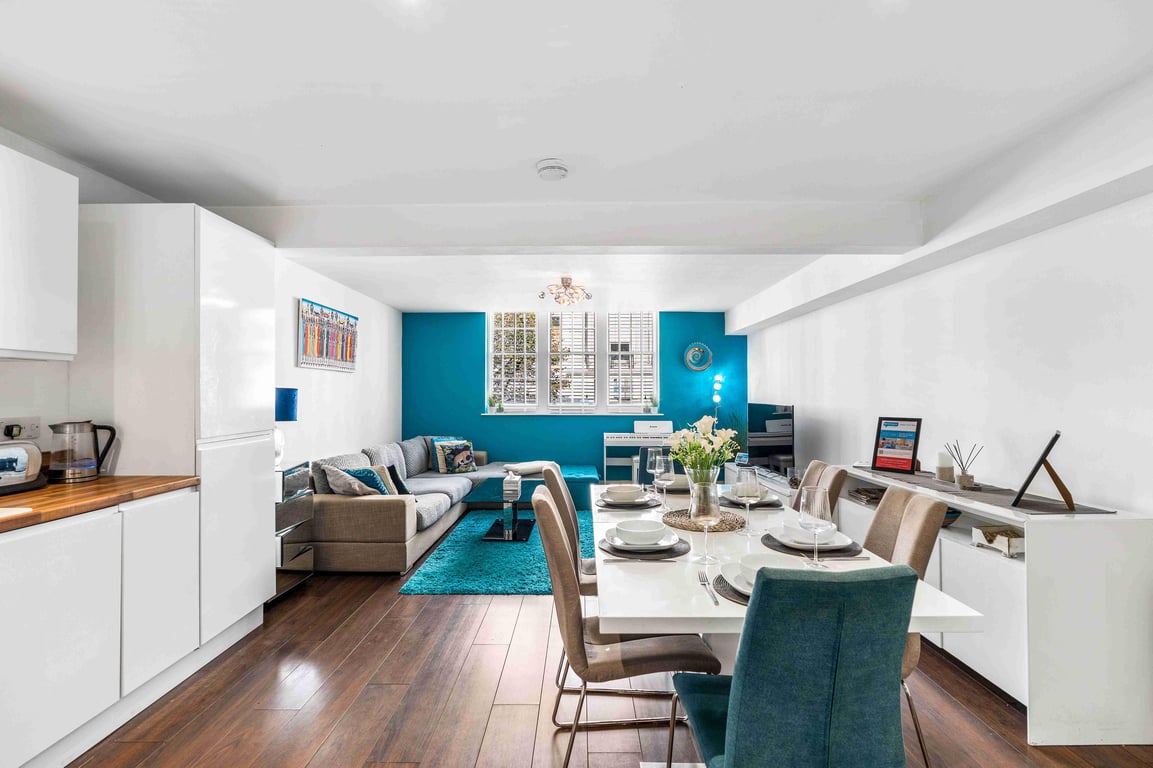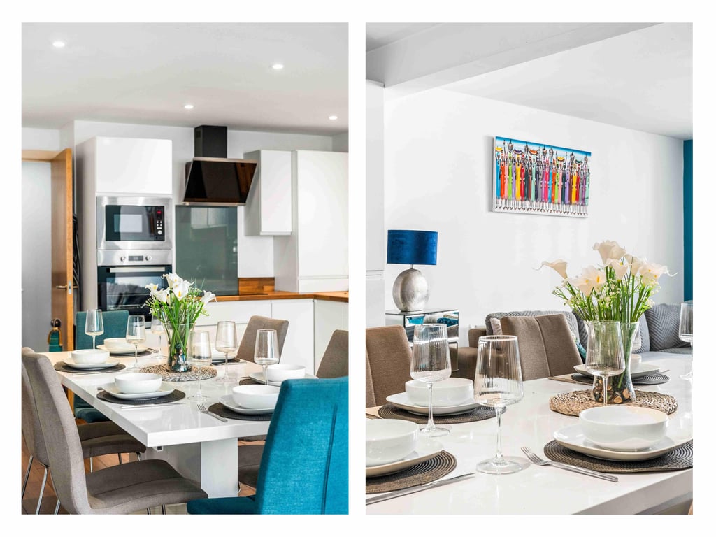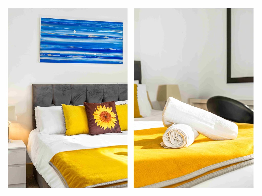 The open-plan living area has vibrant colours and textures to make the space feel homely and inviting, with a fully equipped kitchen that has a washing machine, dishwasher, Induction hob and oven, kettle, plus plenty of cookware, glassware, crockery and cutlery so you can easily cook up a brunch or lunch for everybody. In addition to this, we offer complimentary tea and coffee, salt and pepper - so please help yourself. The dining table seats up to 6 guests. You’ll find the sociable and light living room set up with a Smart TV and a corner sofa, making it a lovely space for chilling out, getting together for a few drinks or catching up on the events of the day. If you prefer, you can simply relax and watch a movie on the TV.
