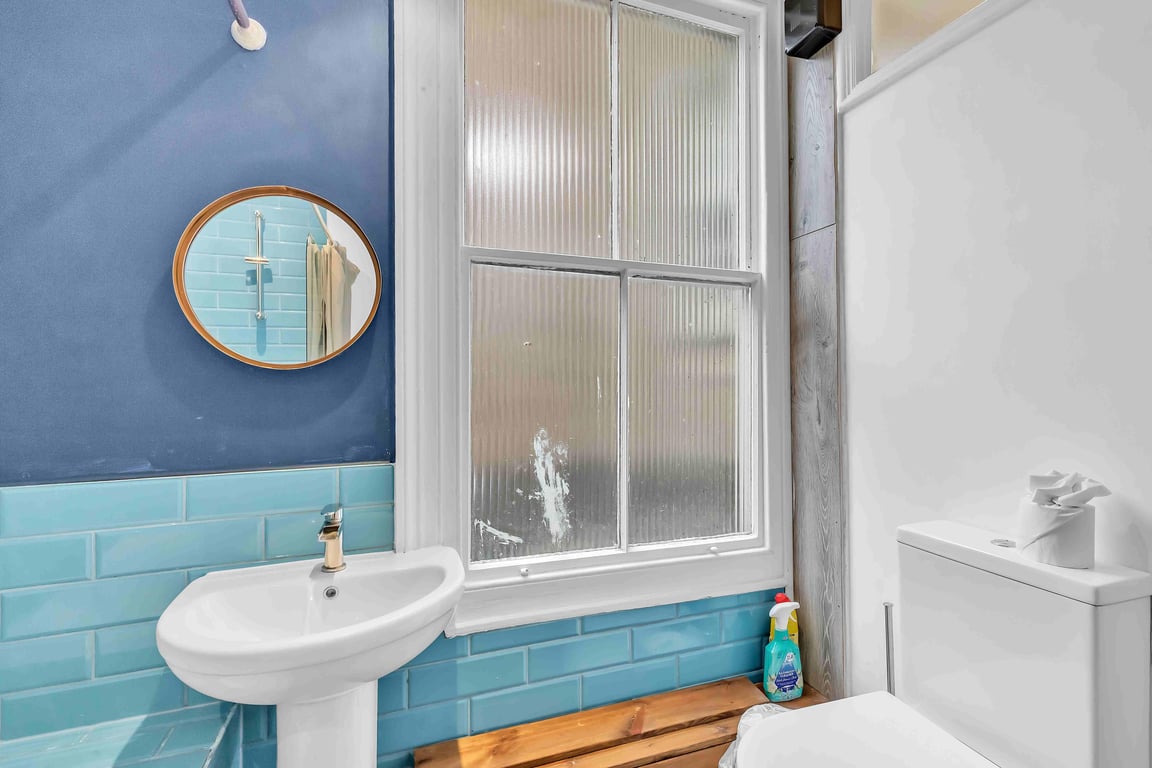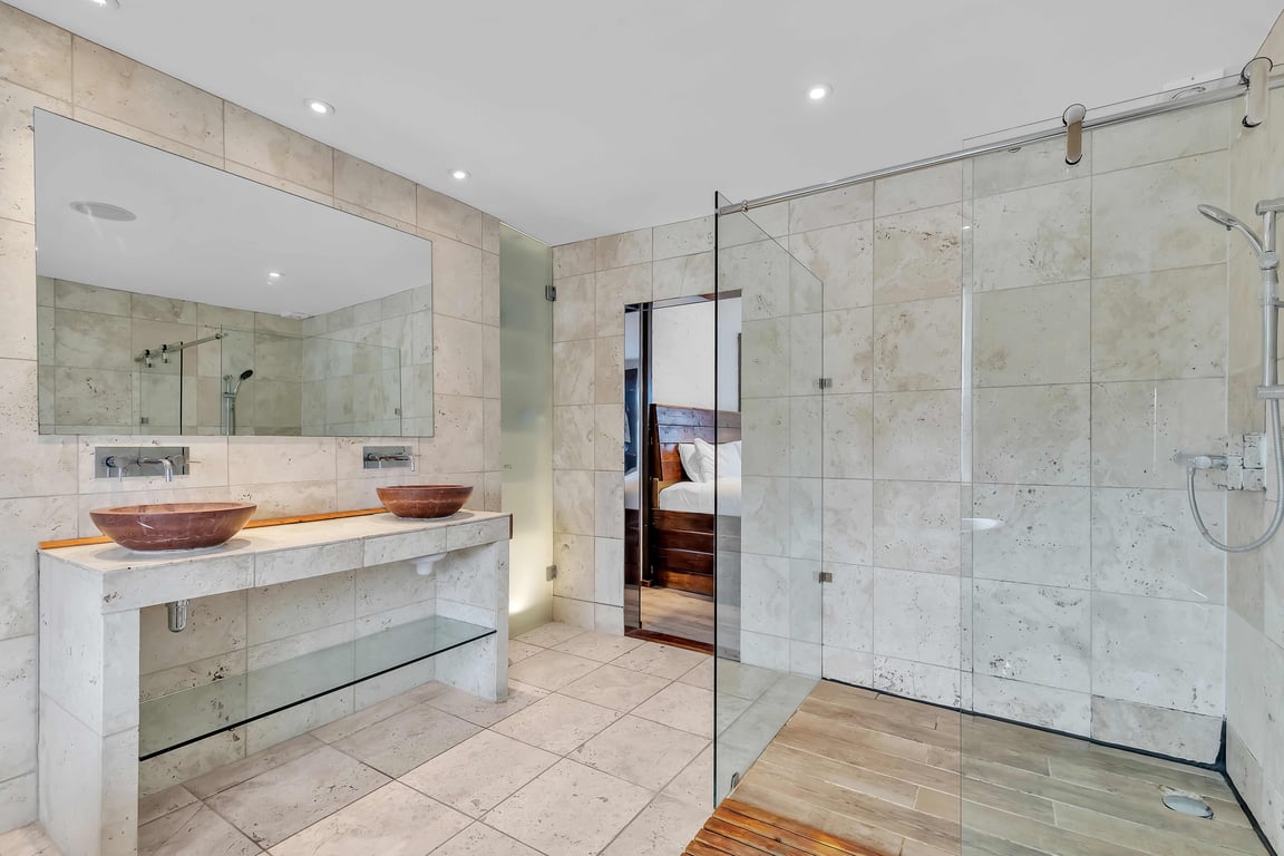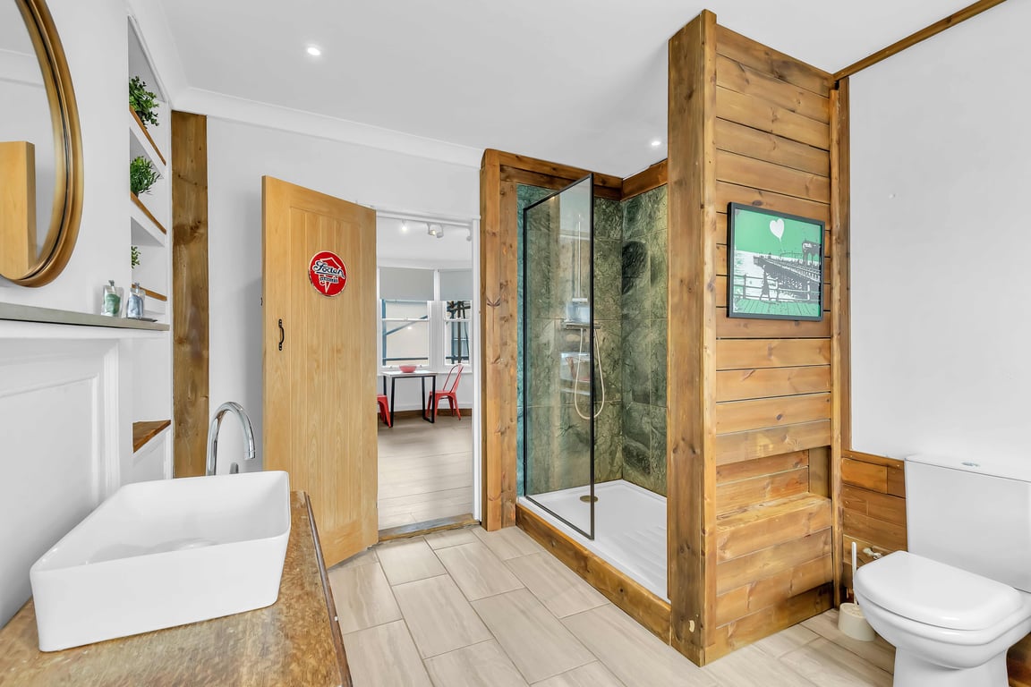 - Grafton Driftwood: Situated on the upper level, and separate (but private and lockable), shower-over-bath, sink, mirror and toilet.