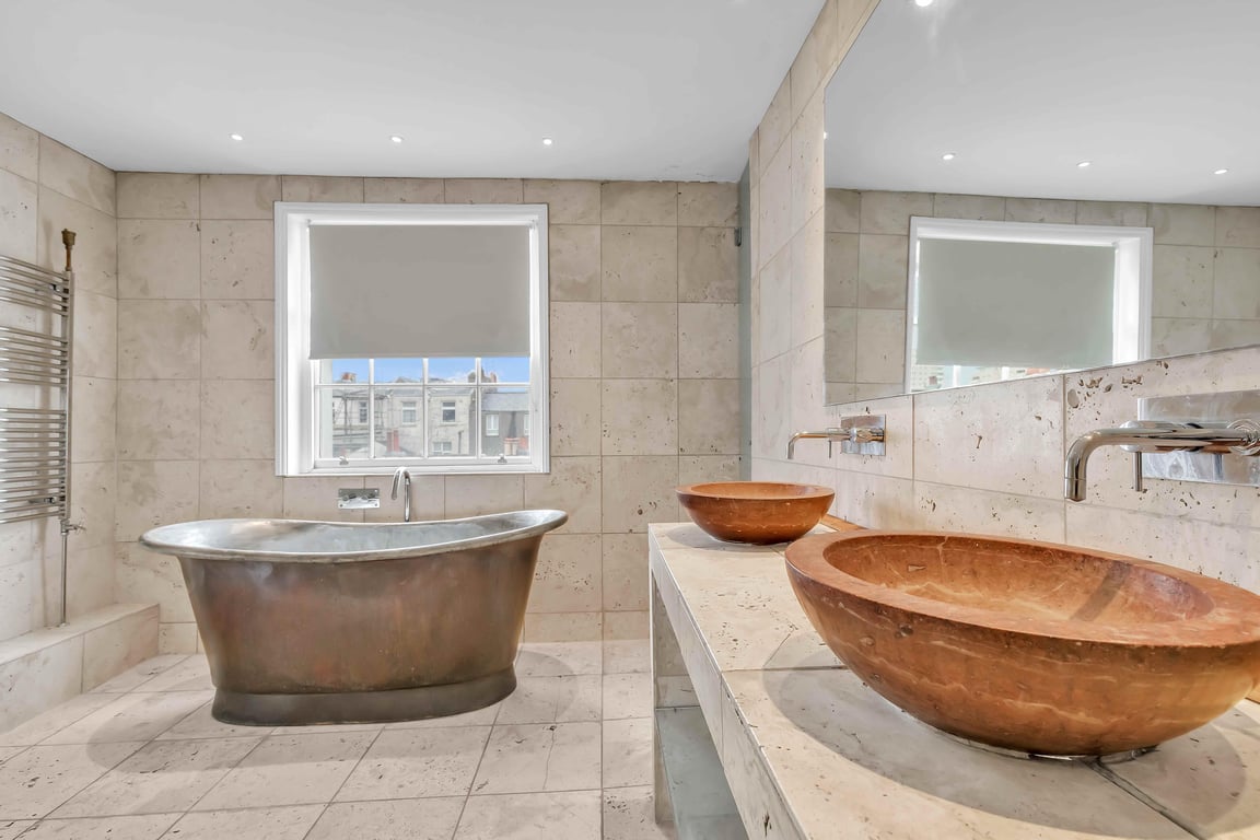 - Grafton Suite: freestanding roll-top bath, walk-in shower, bespoke vanity basin, and toilet