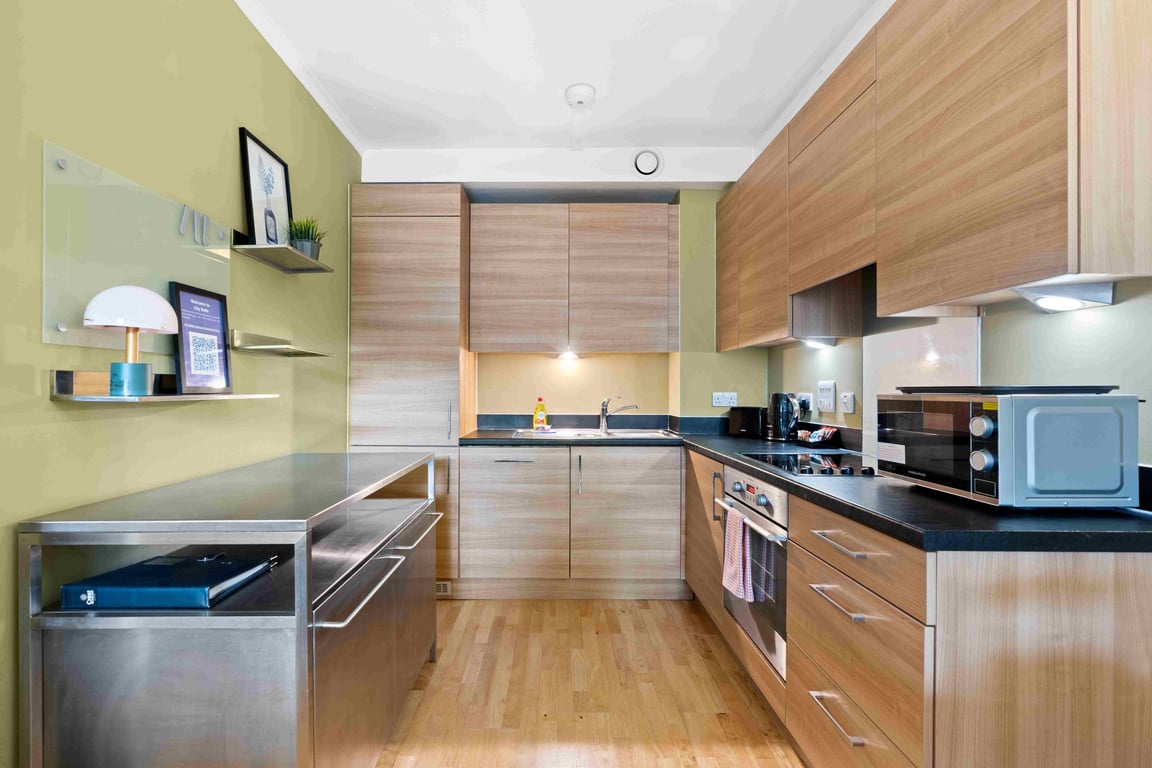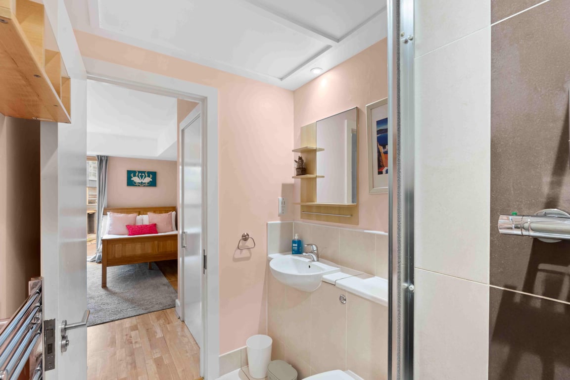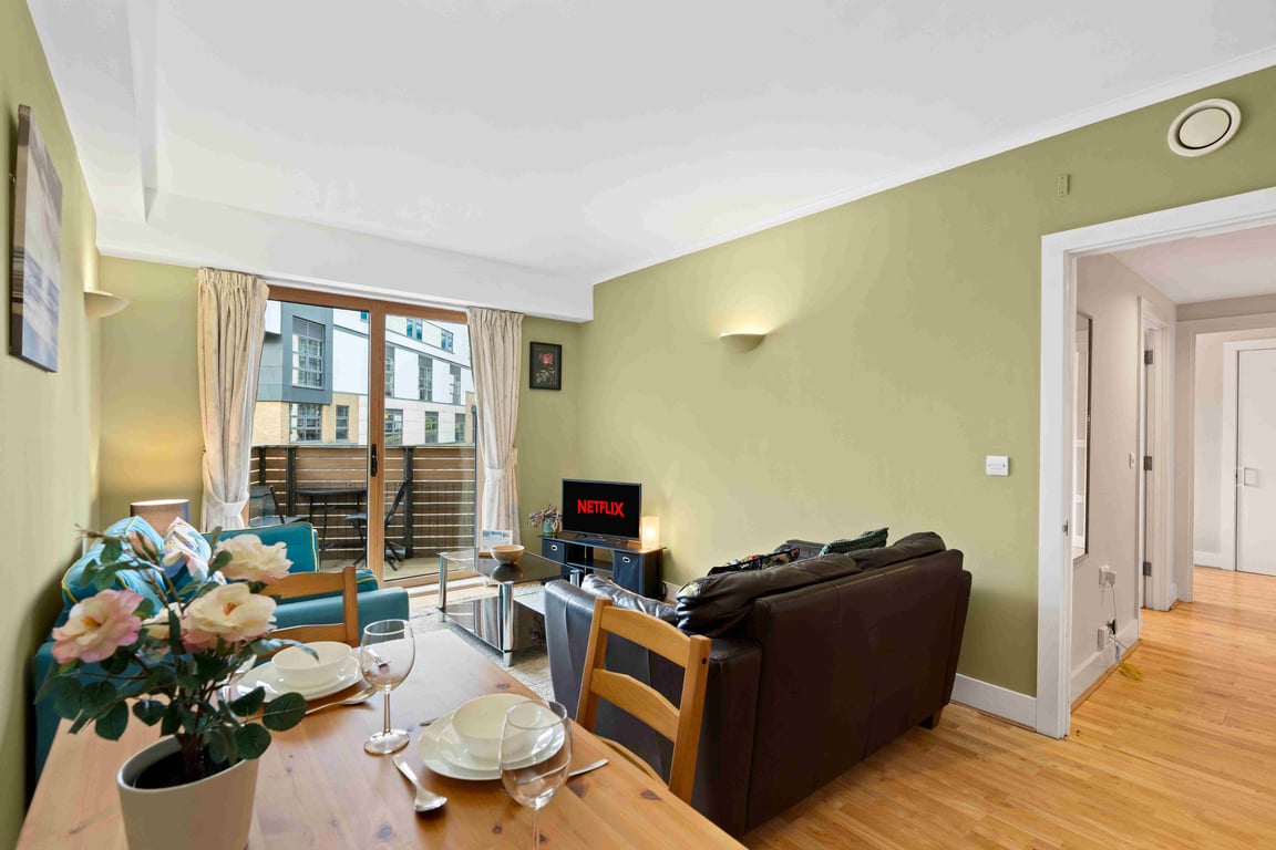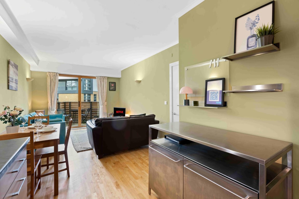 The open plan living area has a relaxing atmosphere with natural daylight pouring in. There is a fully equipped kitchen area for guests, which includes a washer-dryer, dishwasher, microwave, plus plenty of cookware, glassware, crockery and cutlery so you can easily cook up a brunch or lunch for everybody. In addition to this, we offer complimentary tea and coffee, salt and pepper - so please help yourself. You’ll find the sociable and light living room set up with a Smart TV and sofa bed, not yet made up as a bed, making it a lovely space for chilling out, getting together for a few drinks or catching up on the events of the day. If you prefer, you can simply relax and watch a movie on the TV by streaming your favourite show through Netflix or Prime (Just log in with your own account).