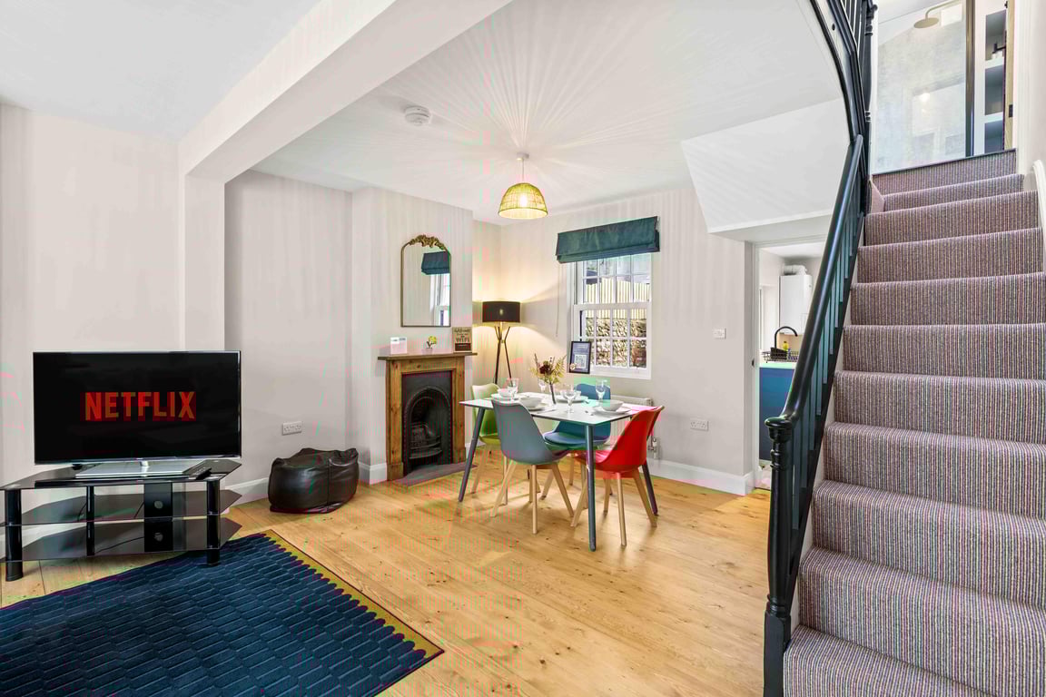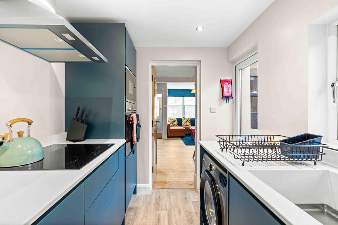 The house boasts a fully equipped kitchen with modern amenities, including a washing machine and dryer. There is a large fridge/freezer, dishwasher, induction hob, microwave, kettle, and plenty of cookware, glassware, crockery, and cutlery, so you can easily prepare a brunch or lunch for everyone. In addition to this, we offer complimentary tea and coffee, salt and pepper - so please help yourself. There is a dining table that seats up to 4 guests in the light living room, which is set up with a Smart TV and double sofa bed, not yet made up as a bed, making it a lovely space for chilling out, getting together for a few drinks or catching up on the events of the day. If you prefer, you can simply relax and watch a movie on the TV.