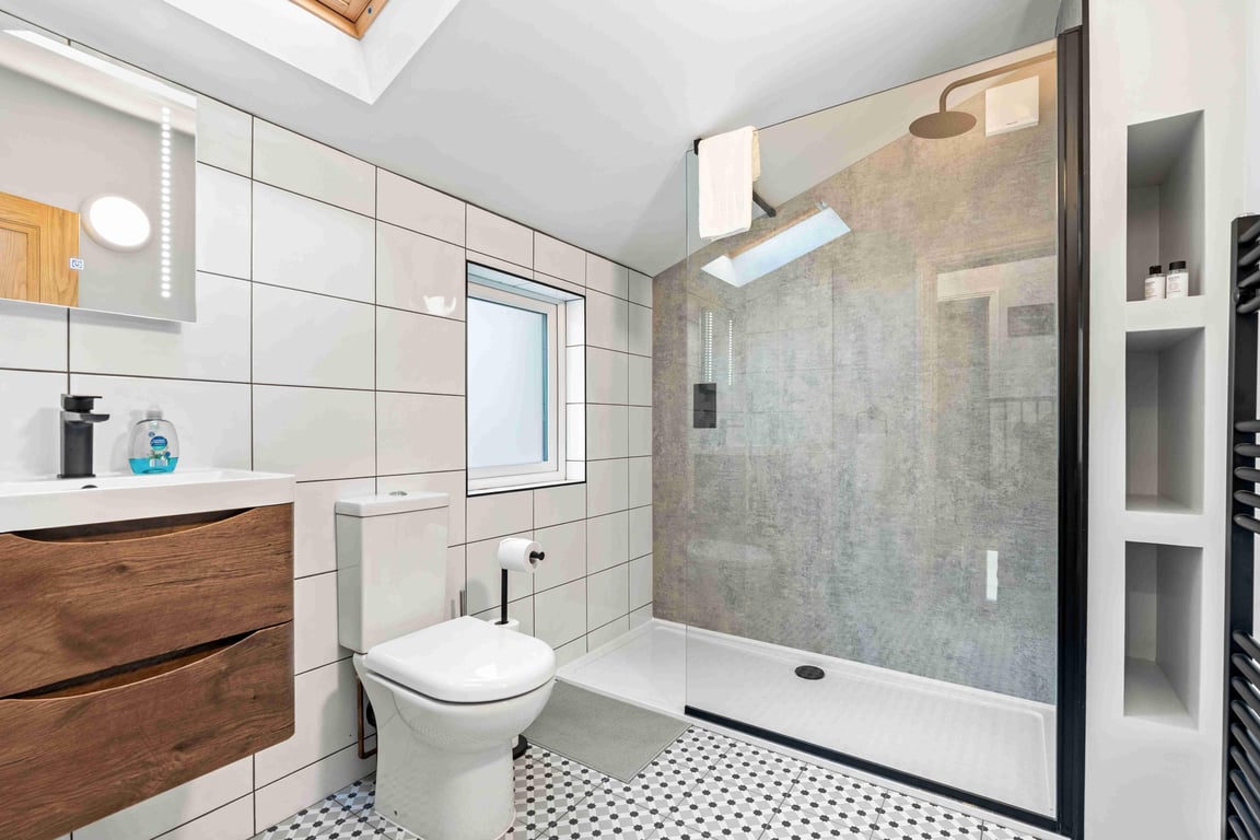 - The bathroom has a large walk-in shower, sink, mirror and toilet. For convenience, you will find a shaver socket on the side of the mirror,