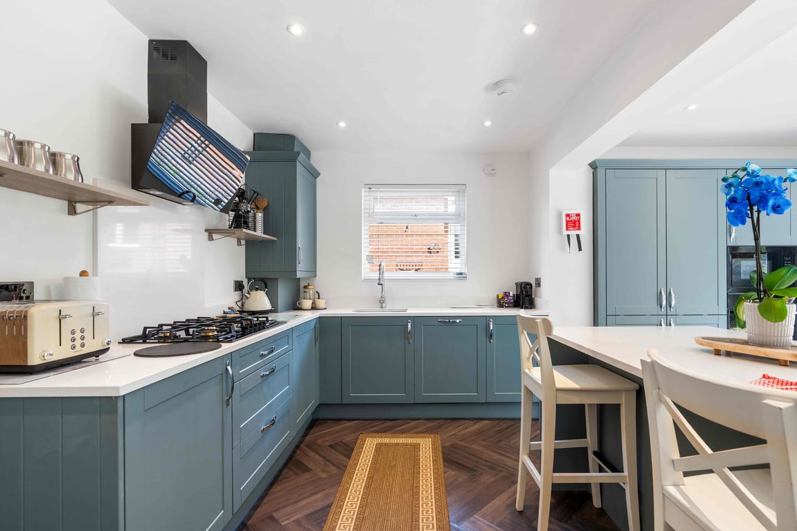 The spacious open-plan living and kitchen area is designed for relaxed, modern coastal living, with a kitchen island table at its heart so the whole group can come together while meals are being prepared. There is also a separate dining table seating 6, alongside two double sofas that make the space feel comfortable and easy to unwind in. When it’s time to relax, you can settle in and enjoy a film on the Smart TV, streaming your favourite shows via Netflix or Prime (just log in with your own account).