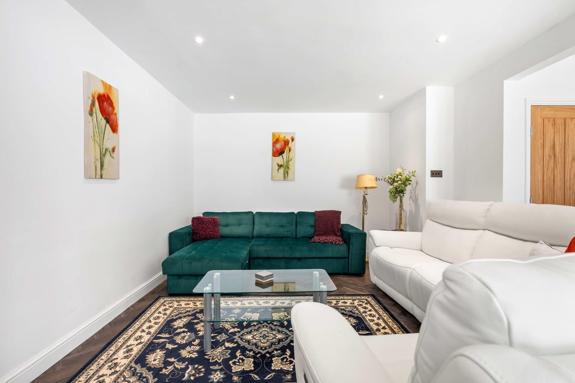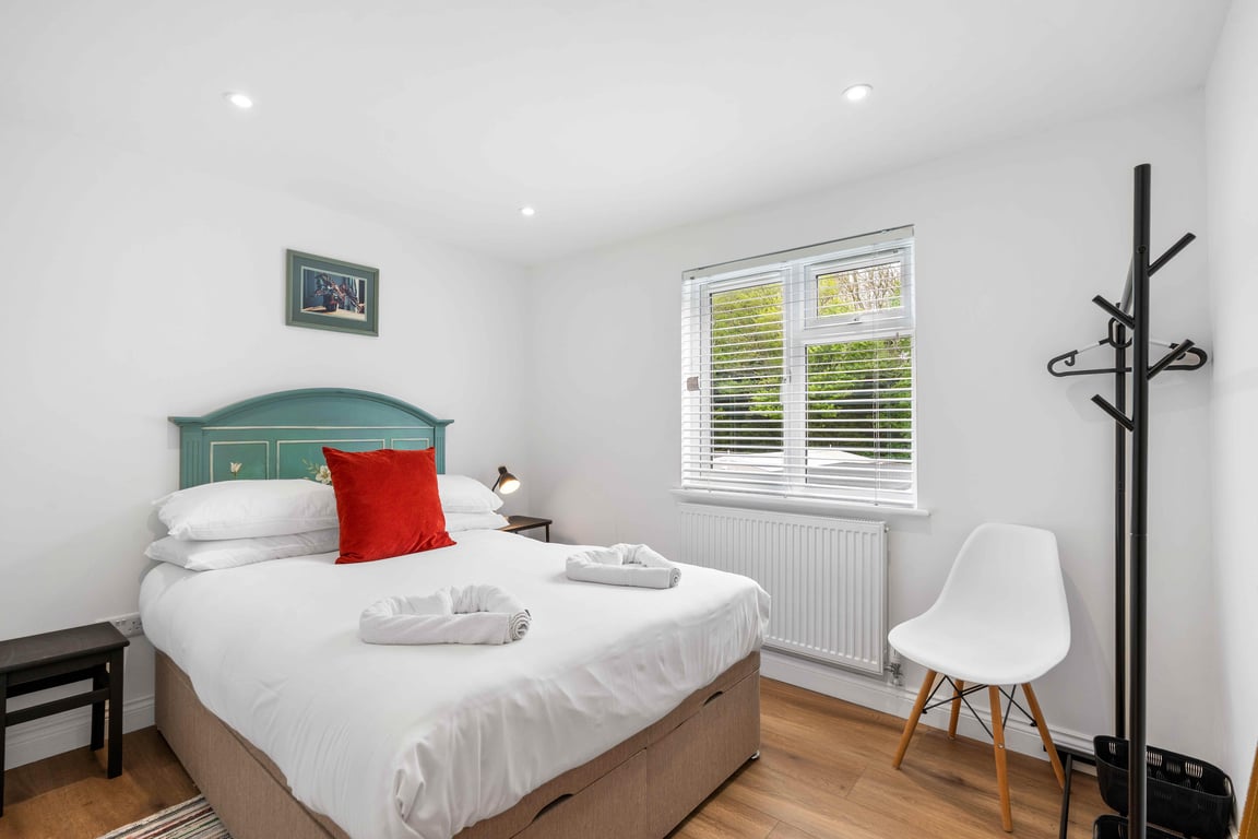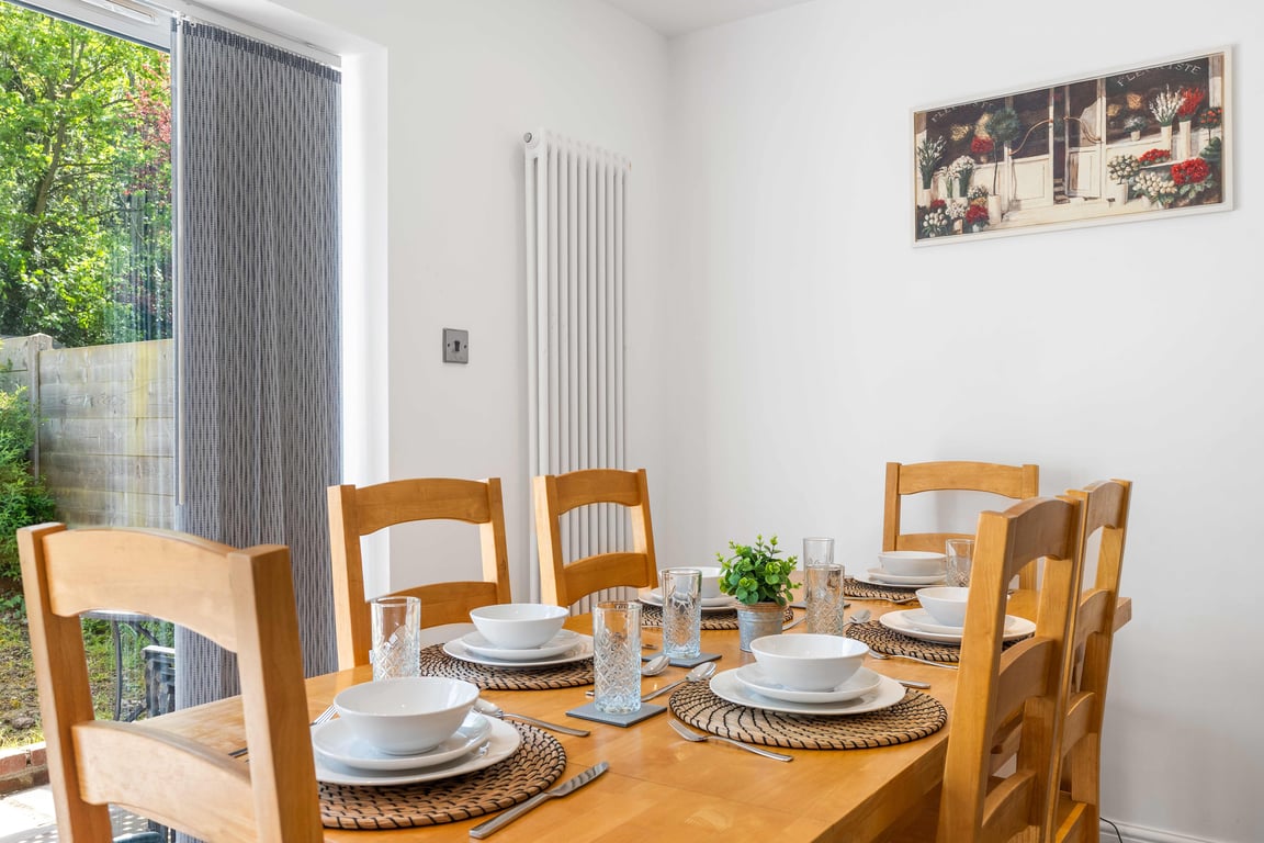The fully equipped kitchen includes a washing machine, dishwasher, gas hob and kettle, plus plenty of cookware, glassware, crockery and cutlery, making it easy to cook and share meals together. Complimentary tea and coffee, along with salt and pepper, are provided for your convenience - so you can simply arrive and help yourself. Large bay windows and a door leading out to the back garden flood the space with natural light, creating a bright and welcoming atmosphere throughout the day.