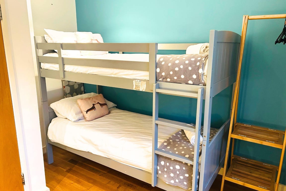 The first bedroom contains two single beds and a bunk bed, a wardrobe and a chest of drawers.